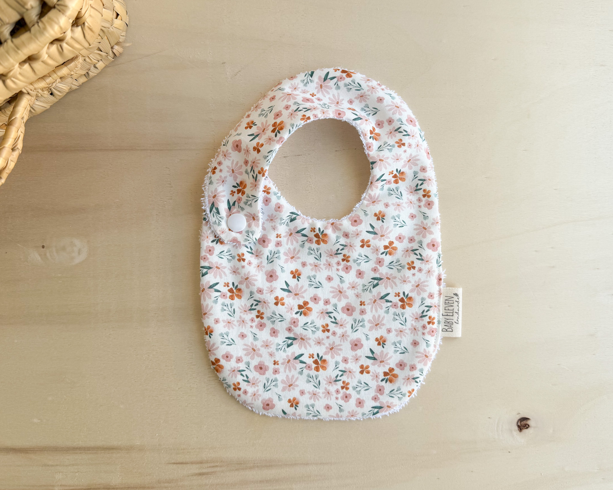 Un babero muy agradable al tacto, suave, confeccionado a mano sin costuras con tejido de algodón orgánico 100% por un lado y rizo de algodón por el otro.