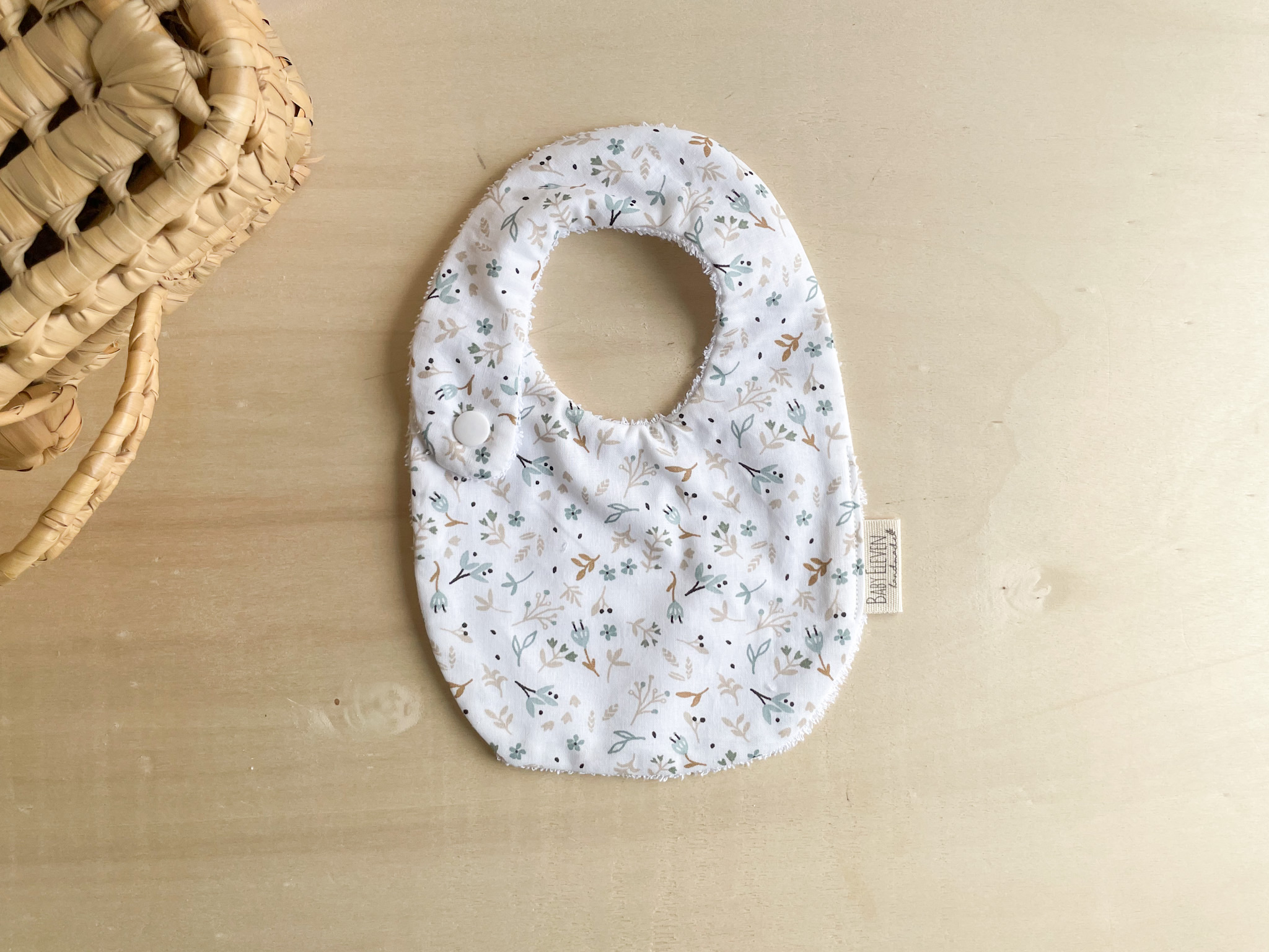 Un babero muy agradable al tacto, suave, confeccionado a mano sin costuras con tejido de algodón orgánico 100% por un lado y rizo de algodón por el otro.