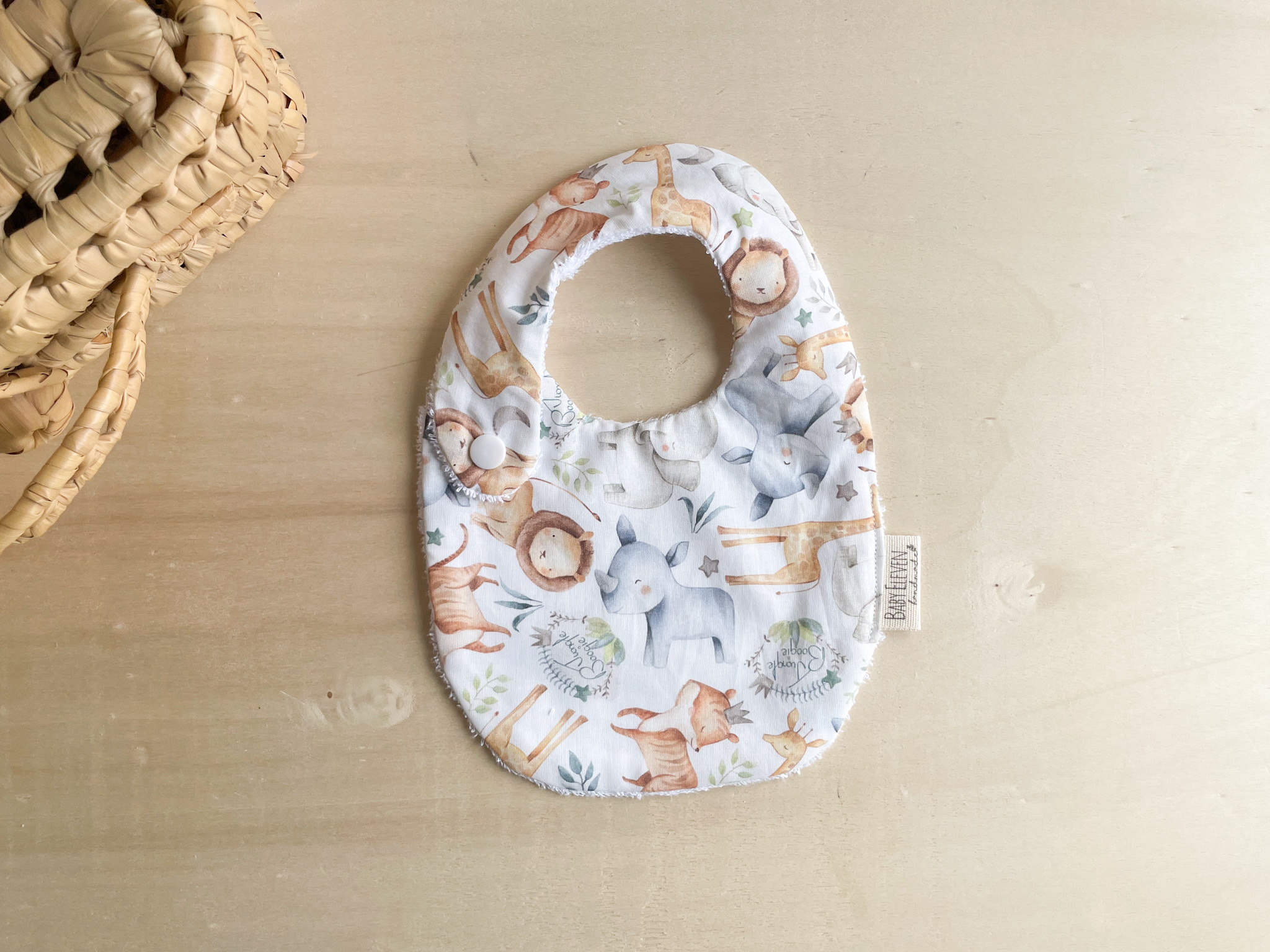 Un babero muy agradable al tacto, suave, confeccionado a mano sin costuras con tejido de algodón orgánico 100% por un lado y rizo de algodón por el otro.