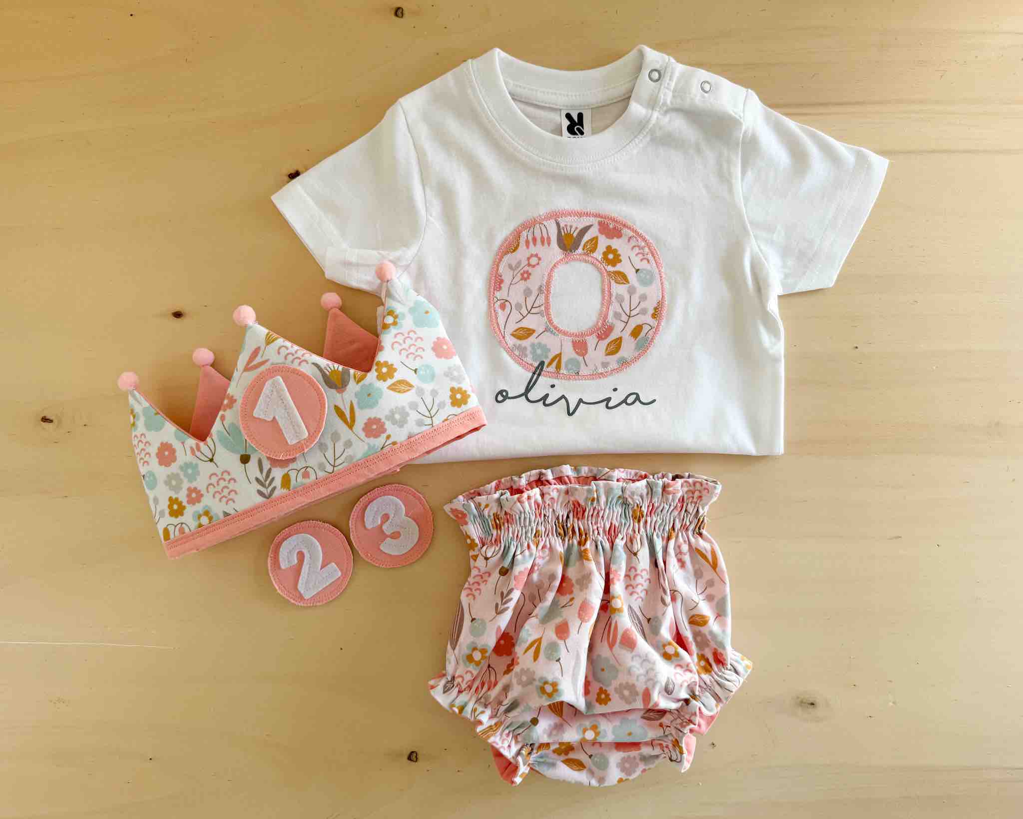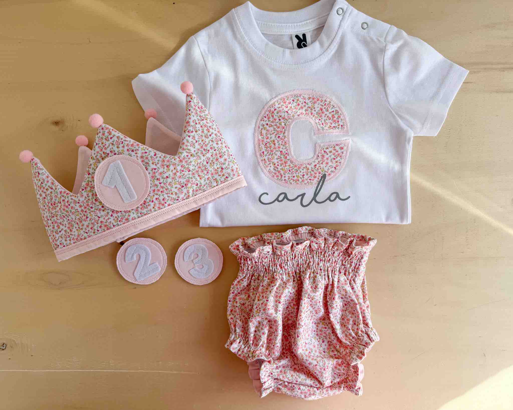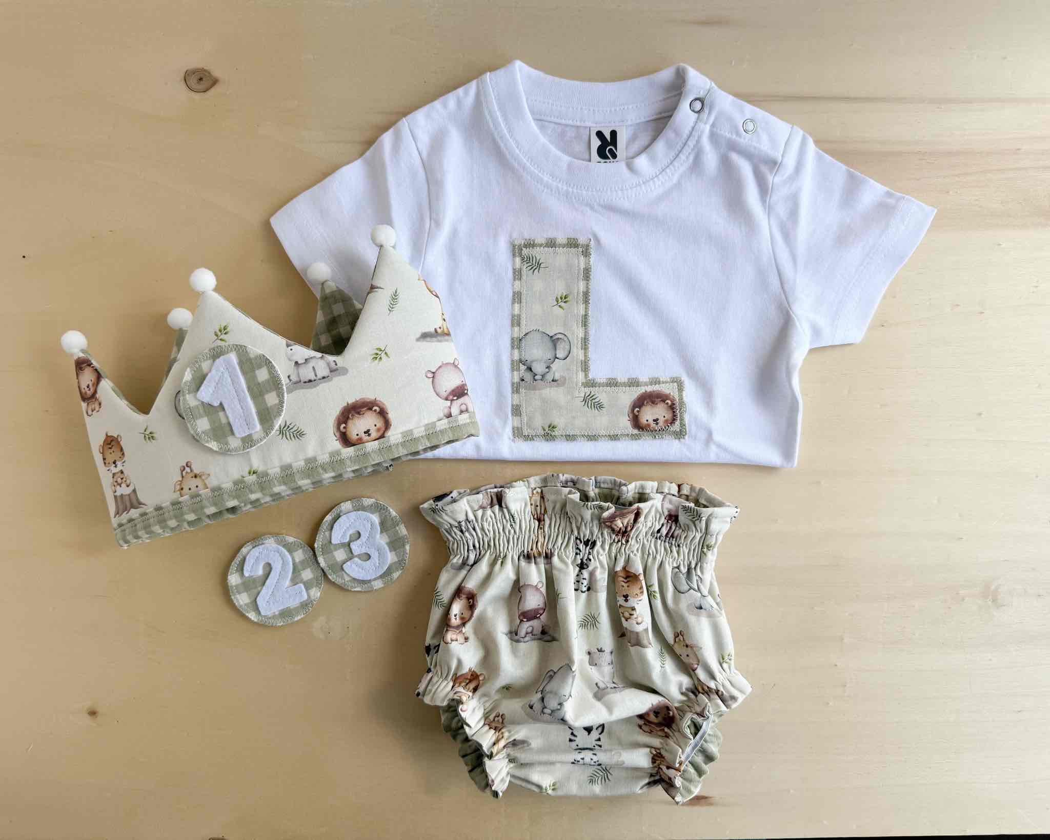 Conjunto de cumpleaños formado por corona con tres números, camiseta con la inicial y cubrepañal a conjunto.