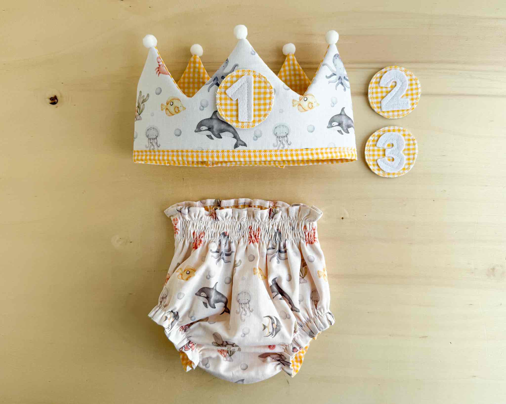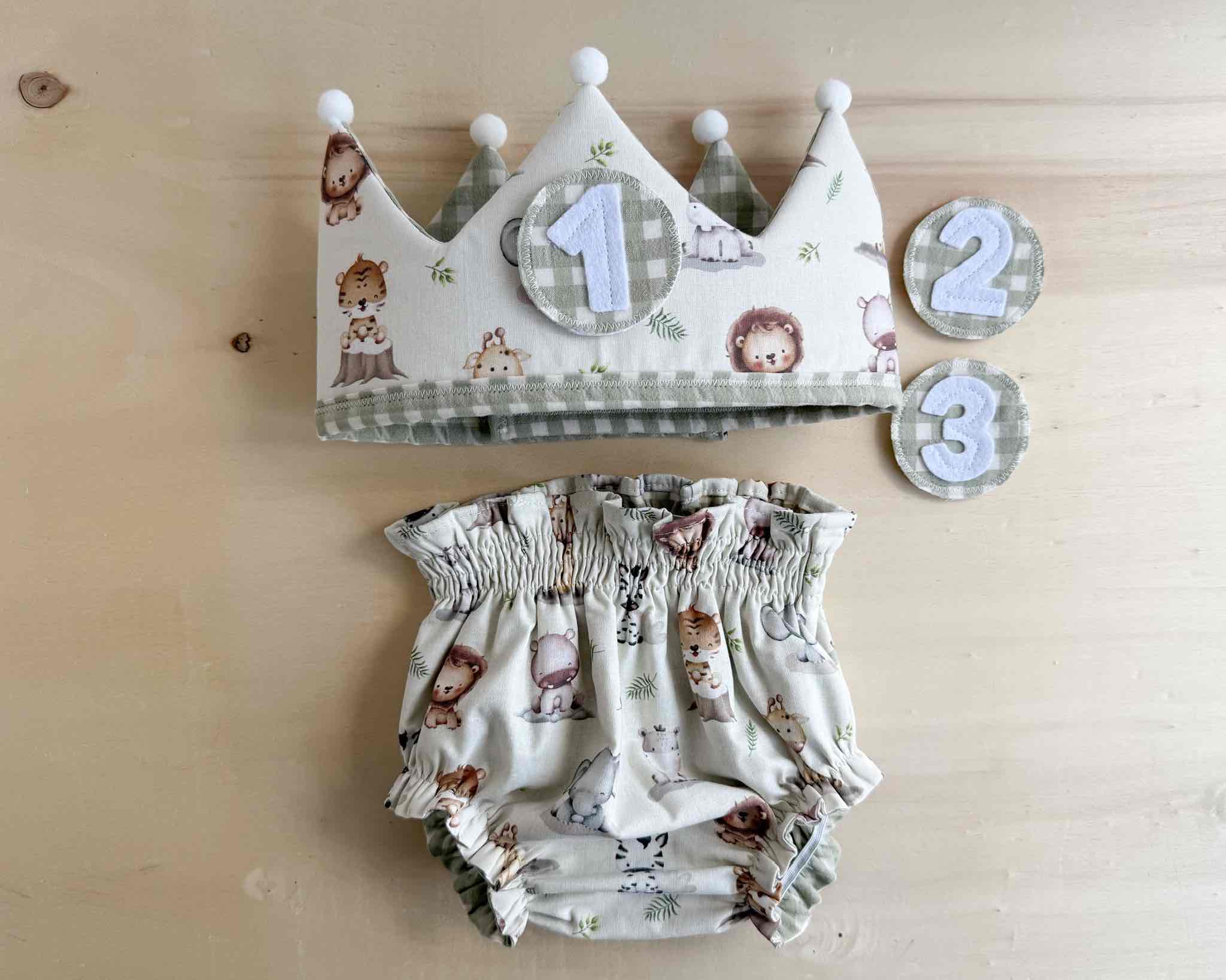 Es una corona mullidita, reversible y ajustable al tamaño de su cabeza. Tendrás dos coronas en una: por el lado estampado podrás poner los números intercambiables (desde el 1 hasta el 3) y por el lado de vichy o liso tendrás una corona diferente para darle más usos y jugar con ella. Además, si quieres añadir el nombre de tu peque para personalizarla, lo pondremos por este lado (el nombre lo hacemos en vinilo textil permanente, con la tipografía que se ve en las fotos y el color de la letra dependerá del que creamos que más bonito quede o mejor se aprecie, aunque si quieres ver otras opciones, solo tienes que comentárnoslo).