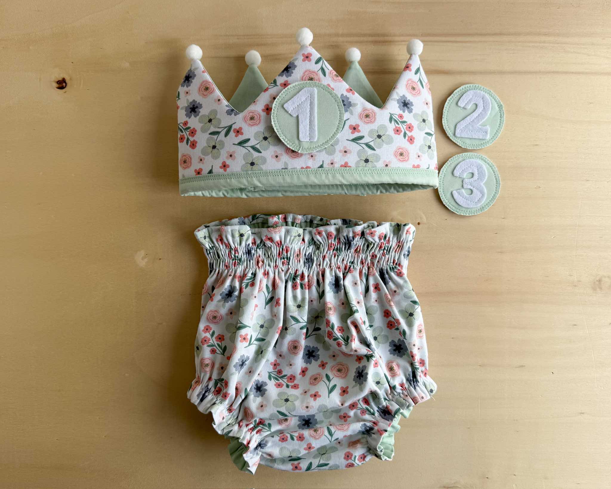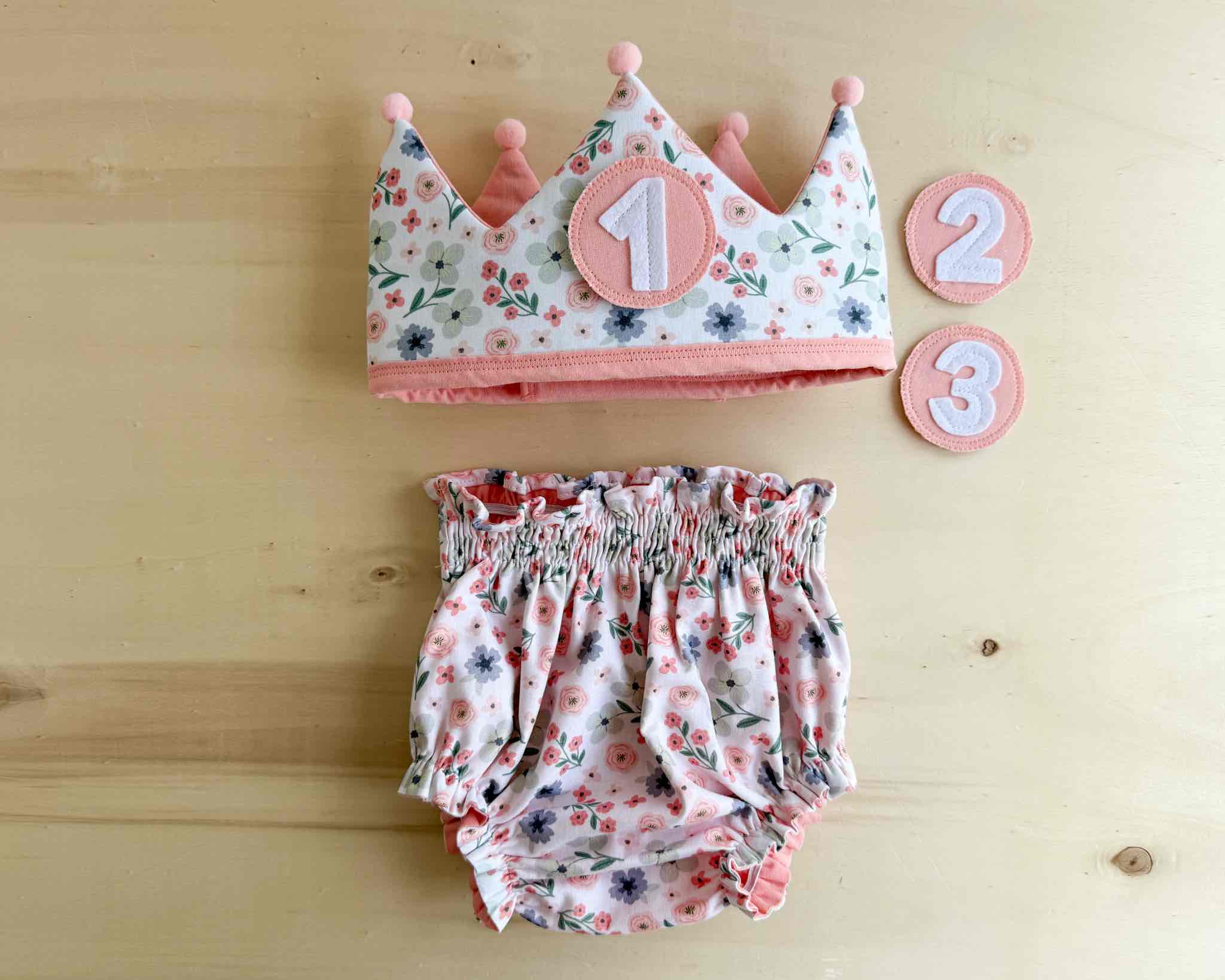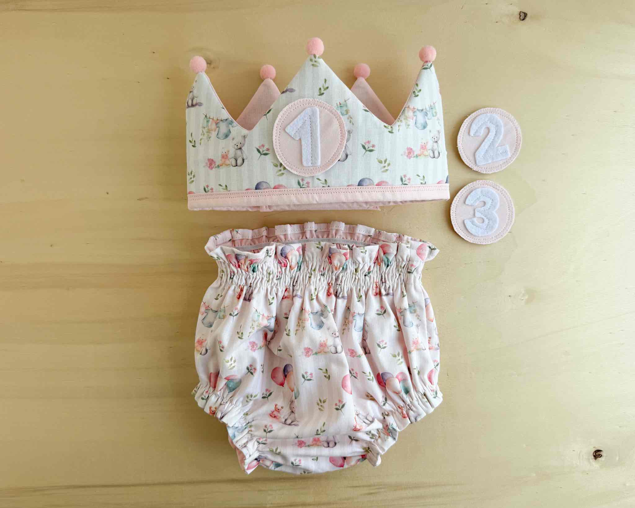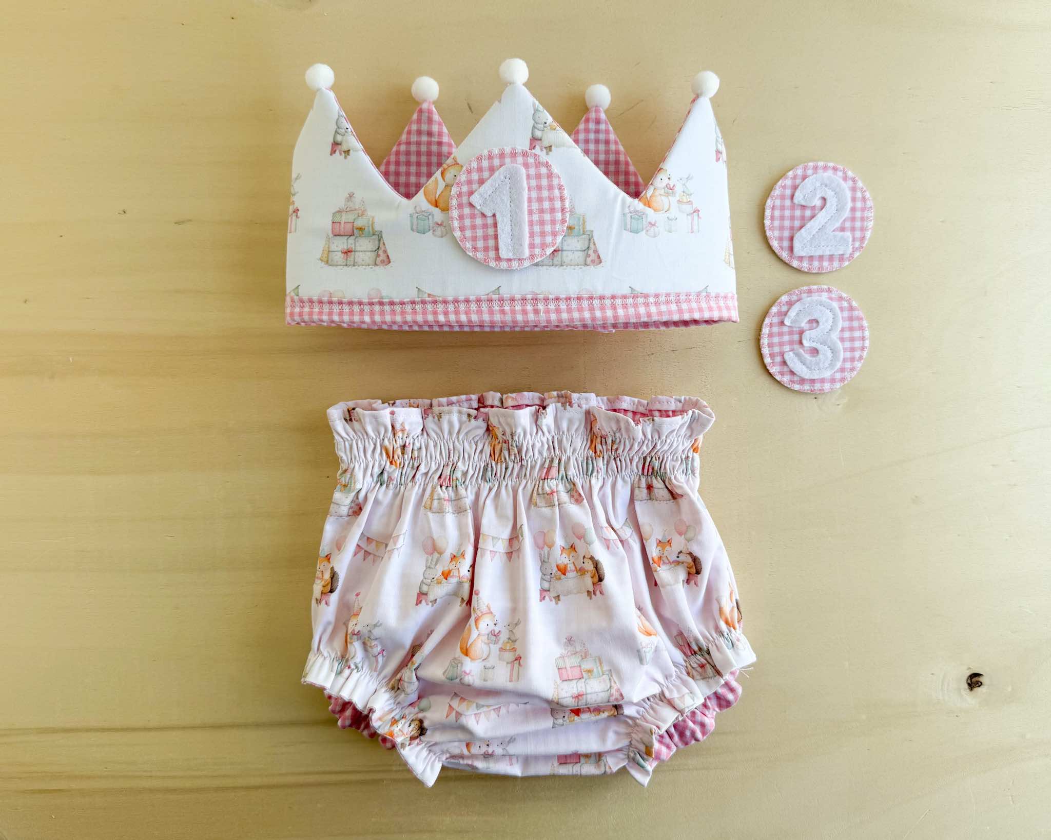 Conjunto de cumpleaños formado por una corona mullidita con tres números y un cubrepañal a conjunto, que podrás elegir en distintas tallas.