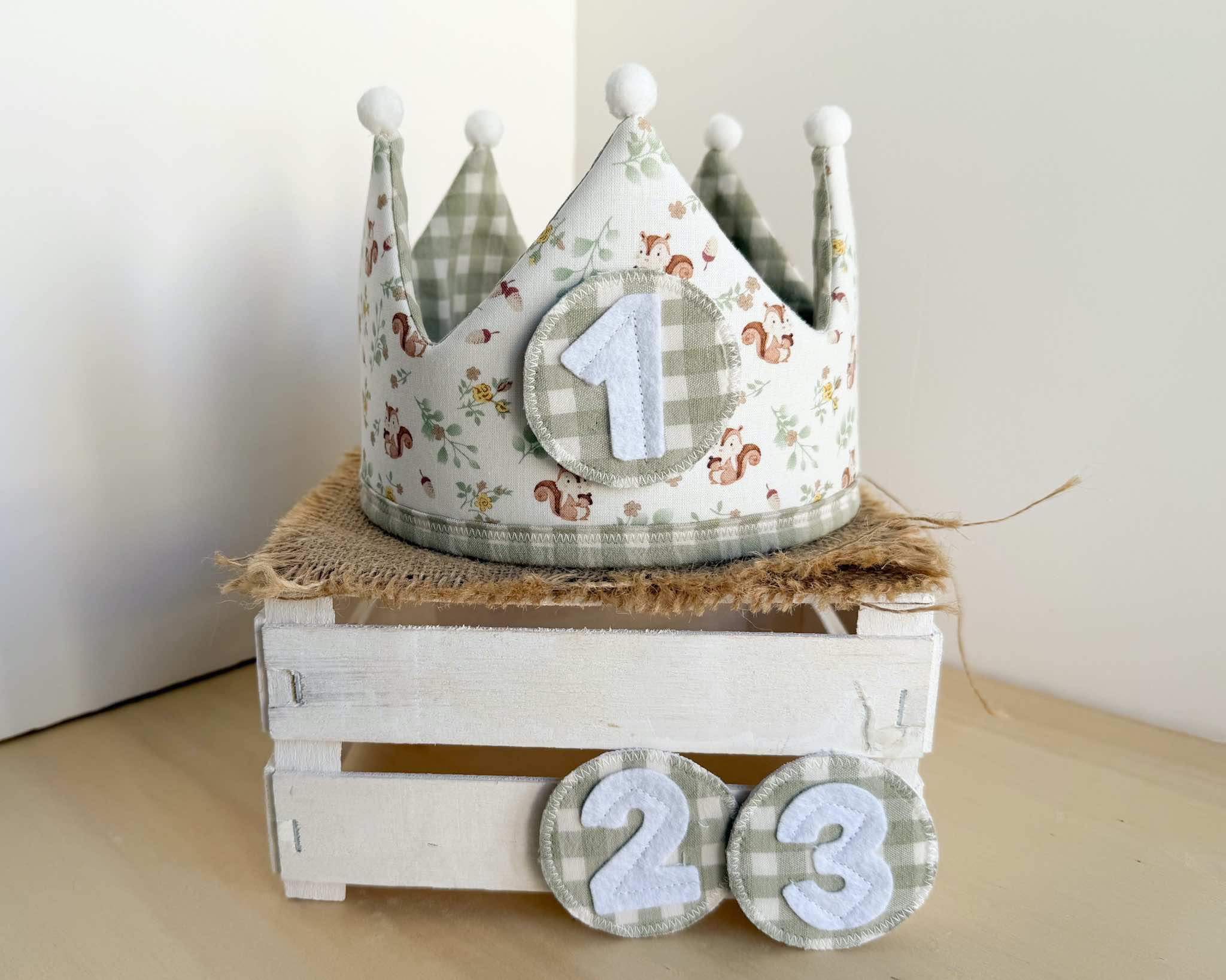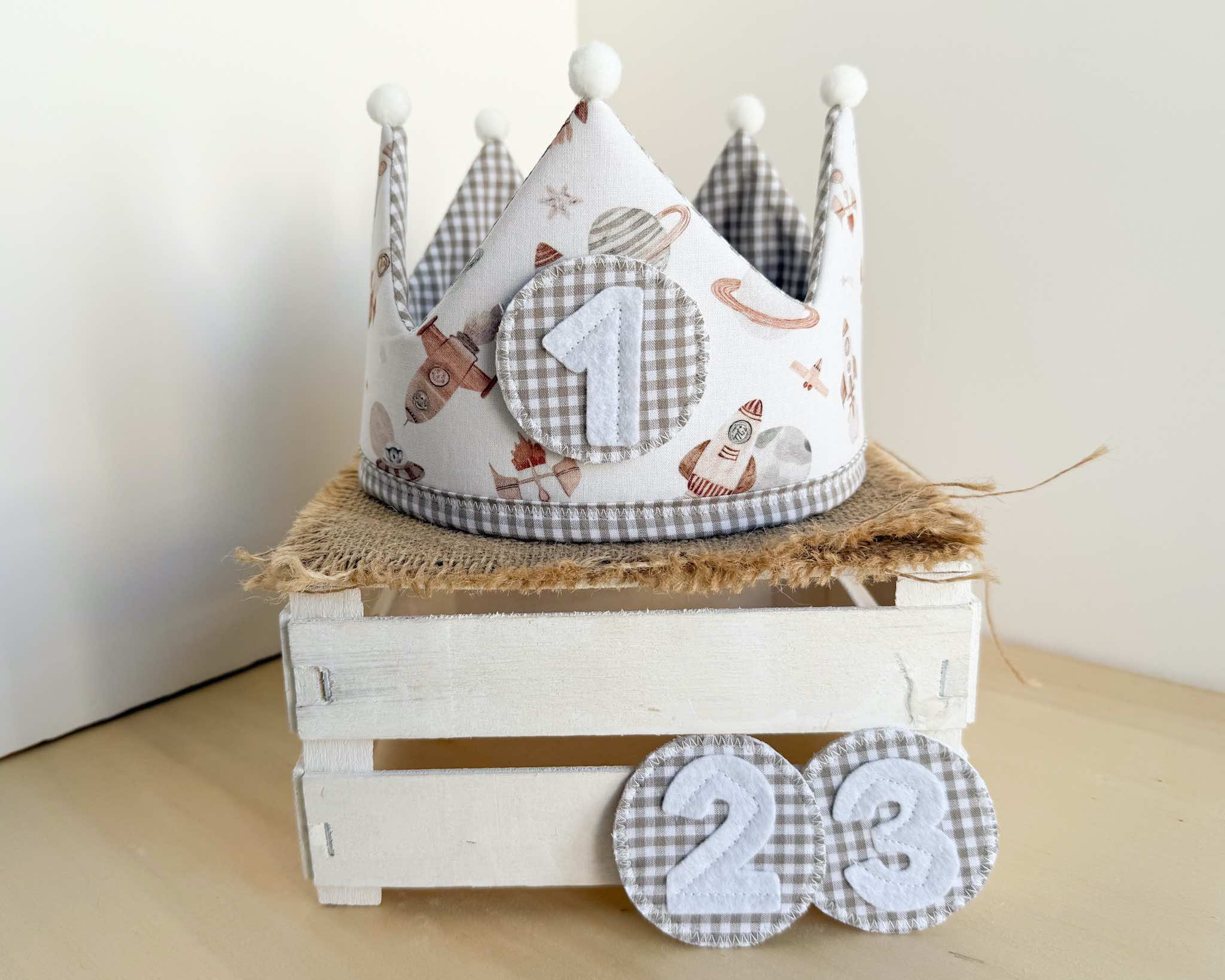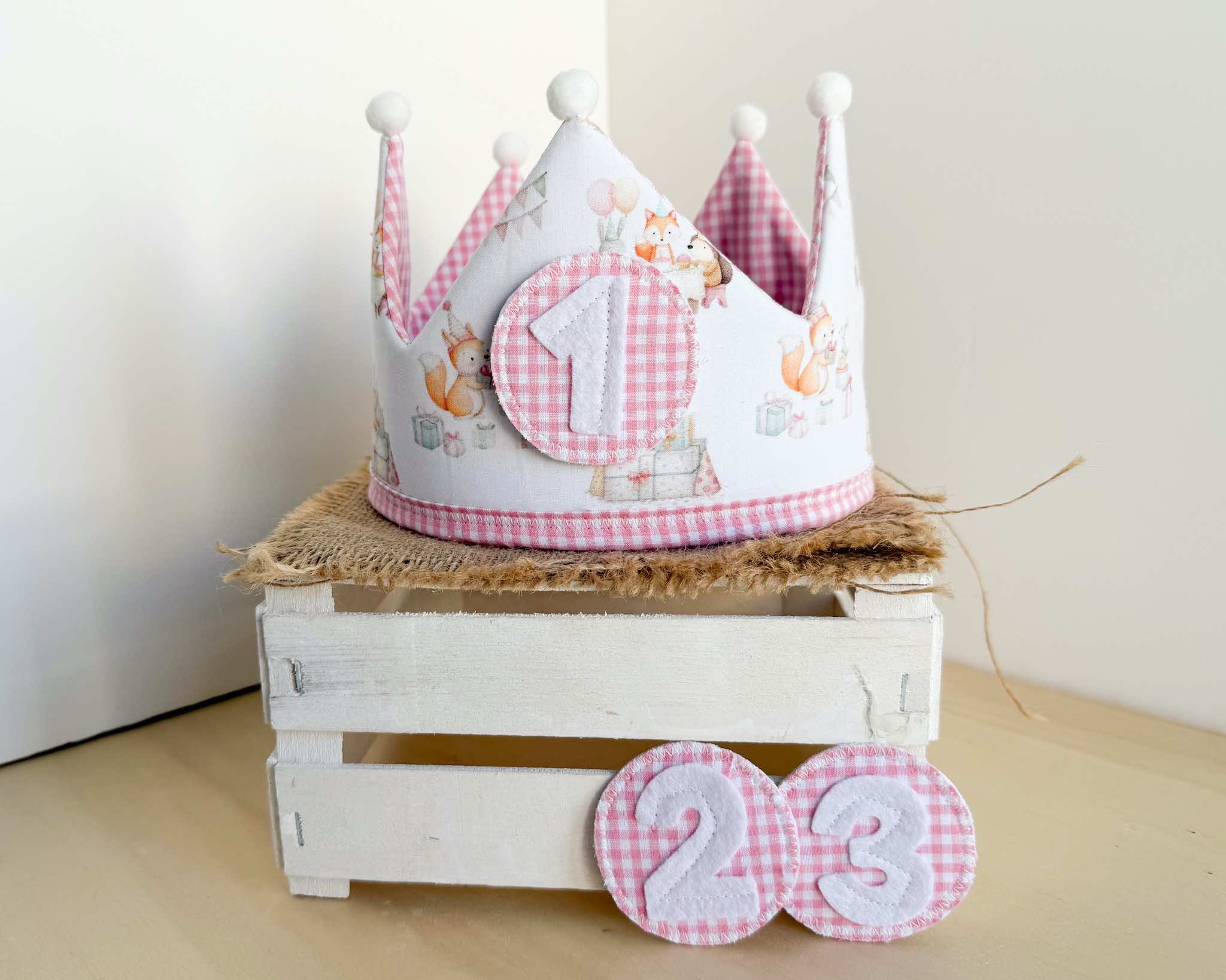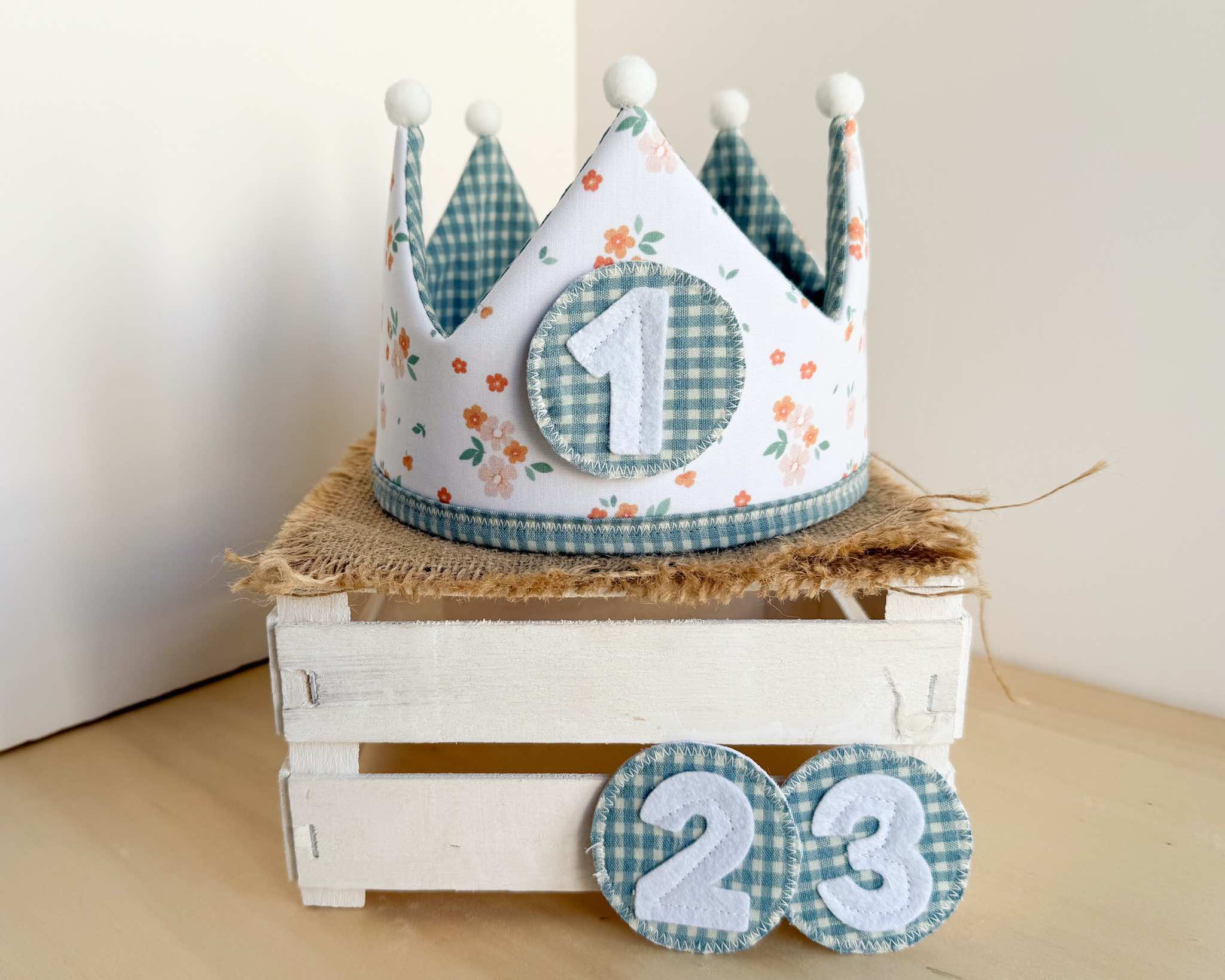 La corona perfecta para celebrar el cumpleaños del peque de la casa. Es una corona mullidita, reversible y ajustable al tamaño de su cabeza. Tendrás dos coronas en una: por el lado estampado podrás poner los números intercambiables (desde el 1 hasta el 3) y por el lado de vichy o liso tendrás una corona diferente para darle más usos y jugar con ella. Además, si quieres añadir el nombre de tu peque para personalizarla, lo pondremos por este lado (el nombre lo hacemos en vinilo textil permanente, con la tipografía que se ve en las fotos y el color de la letra dependerá del que creamos que más bonito quede o mejor se aprecie, aunque si quieres ver otras opciones, solo tienes que comentárnoslo).