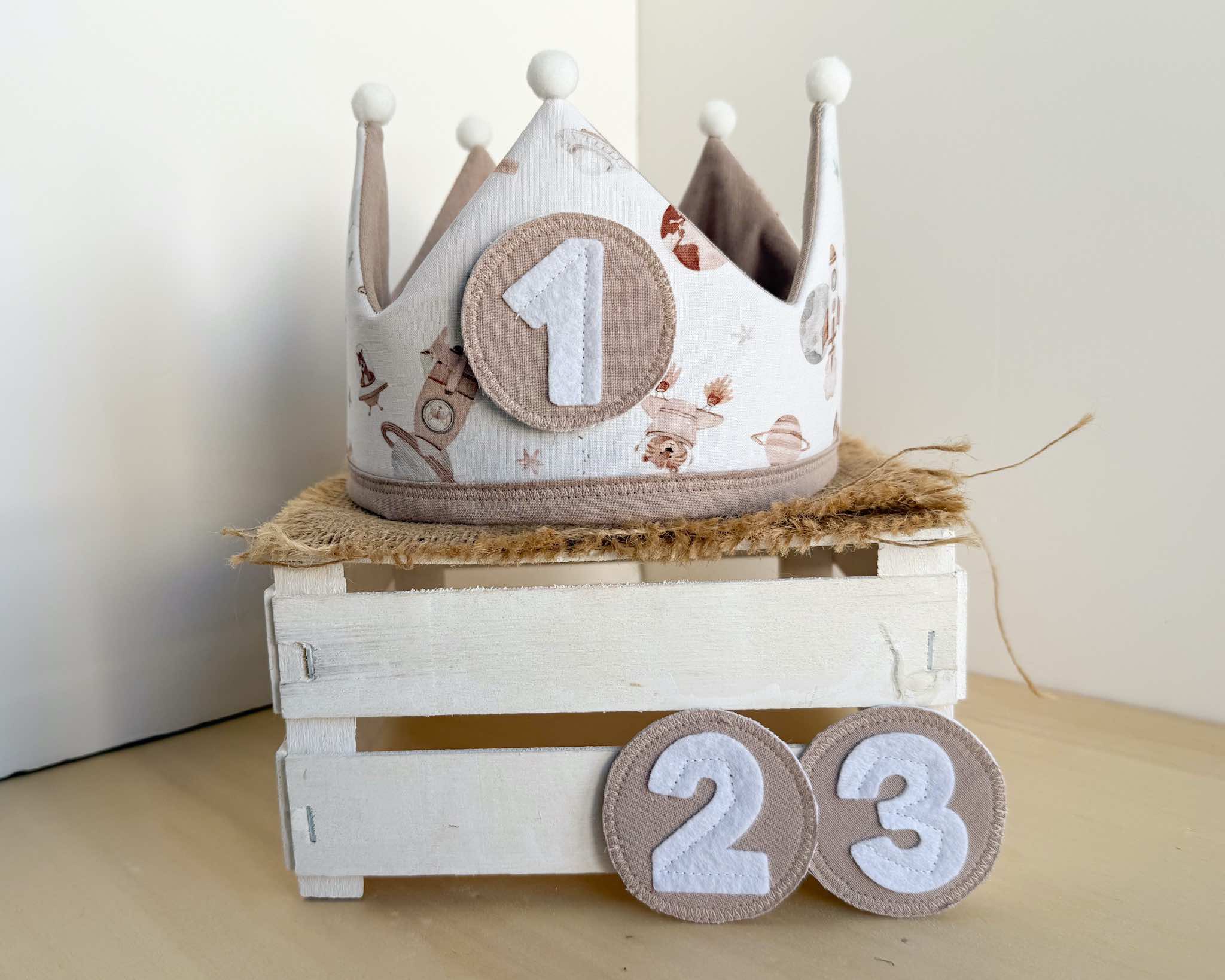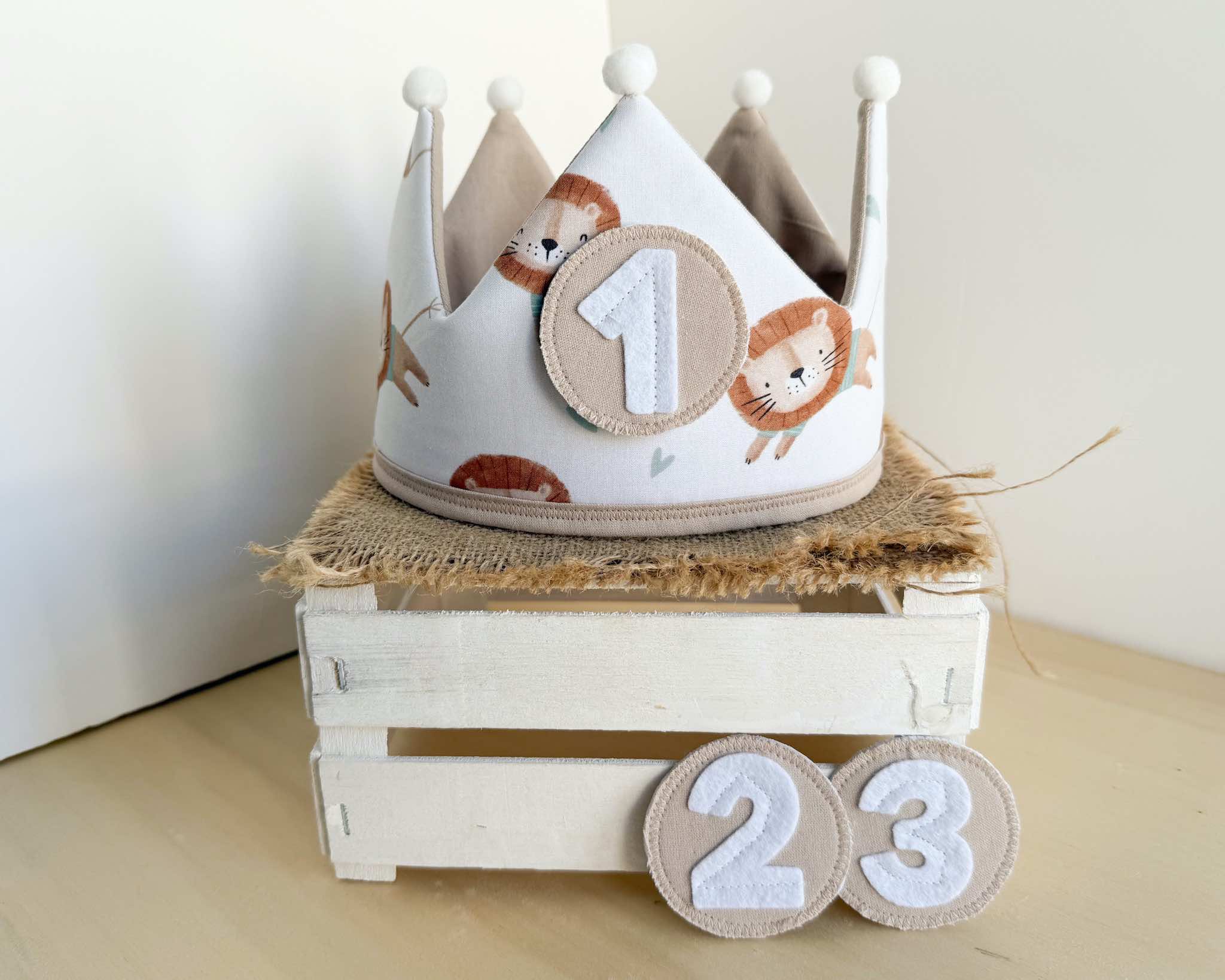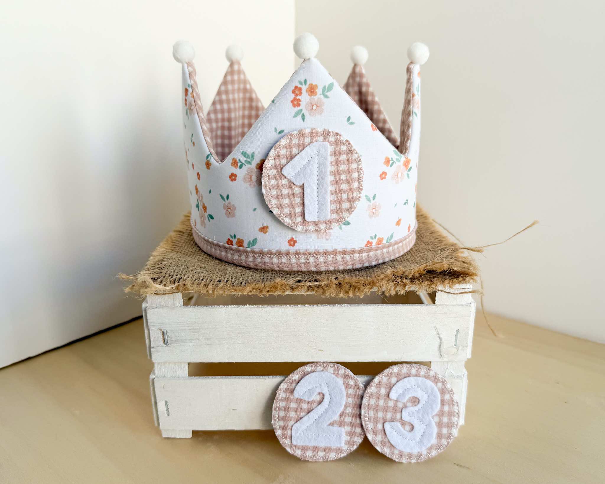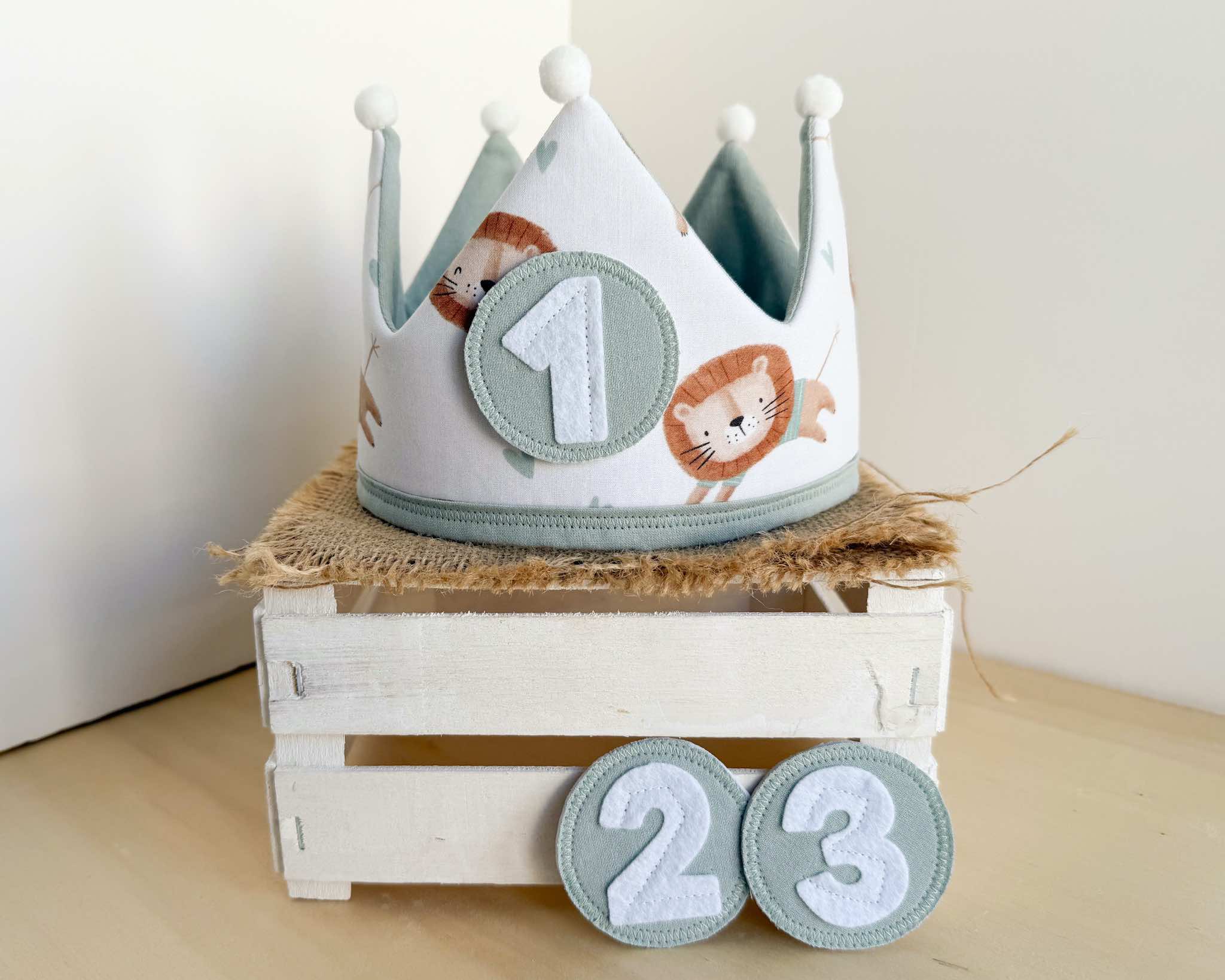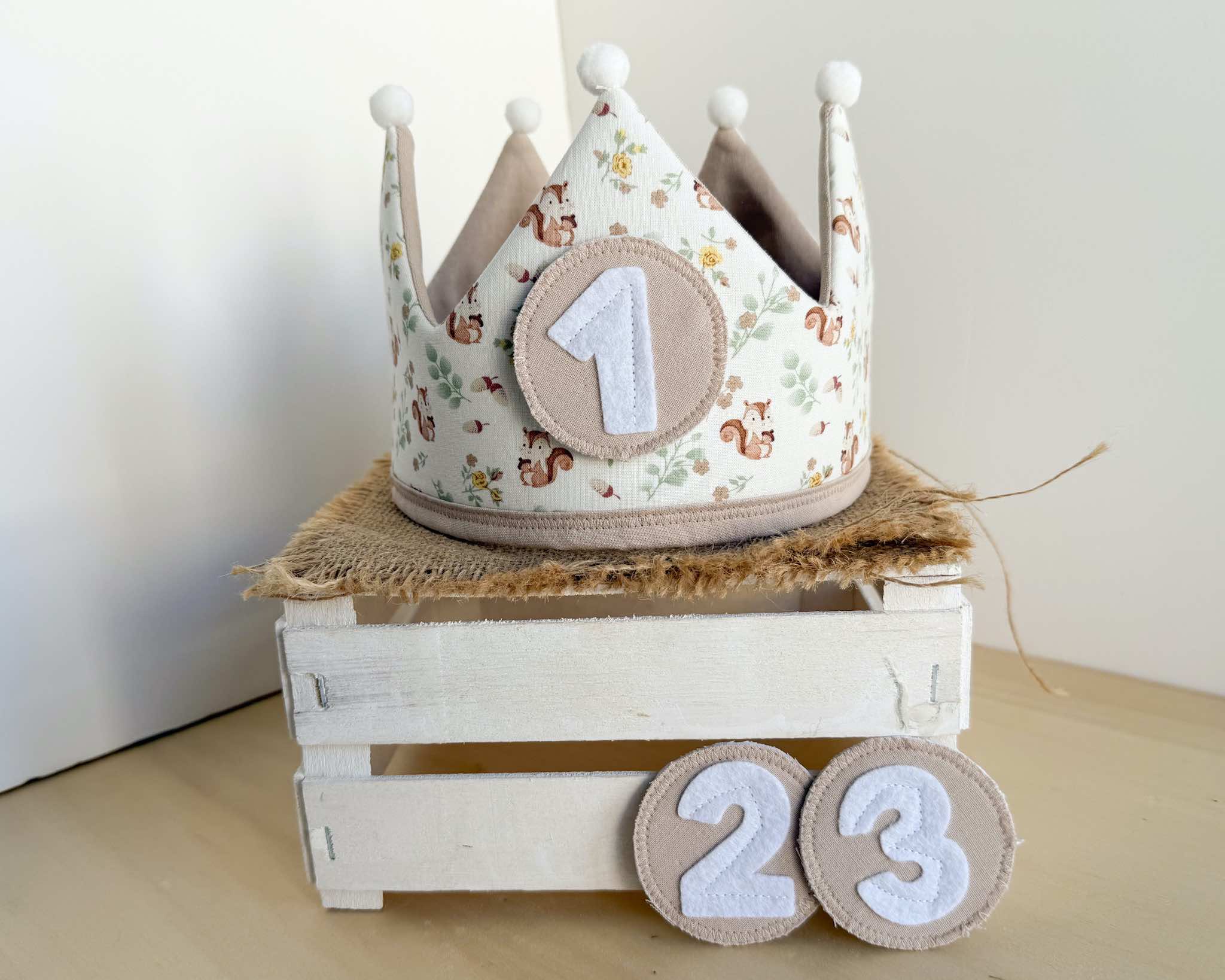 La corona perfecta para celebrar el cumpleaños del peque de la casa. Es una corona mullidita, reversible y ajustable al tamaño de su cabeza. Tendrás dos coronas en una: por el lado estampado podrás poner los números intercambiables (desde el 1 hasta el 3) y por el lado de vichy o liso tendrás una corona diferente para darle más usos y jugar con ella. Además, si quieres añadir el nombre de tu peque para personalizarla, lo pondremos por este lado (el nombre lo hacemos en vinilo textil permanente, con la tipografía que se ve en las fotos y el color de la letra dependerá del que creamos que más bonito quede o mejor se aprecie, aunque si quieres ver otras opciones, solo tienes que comentárnoslo).