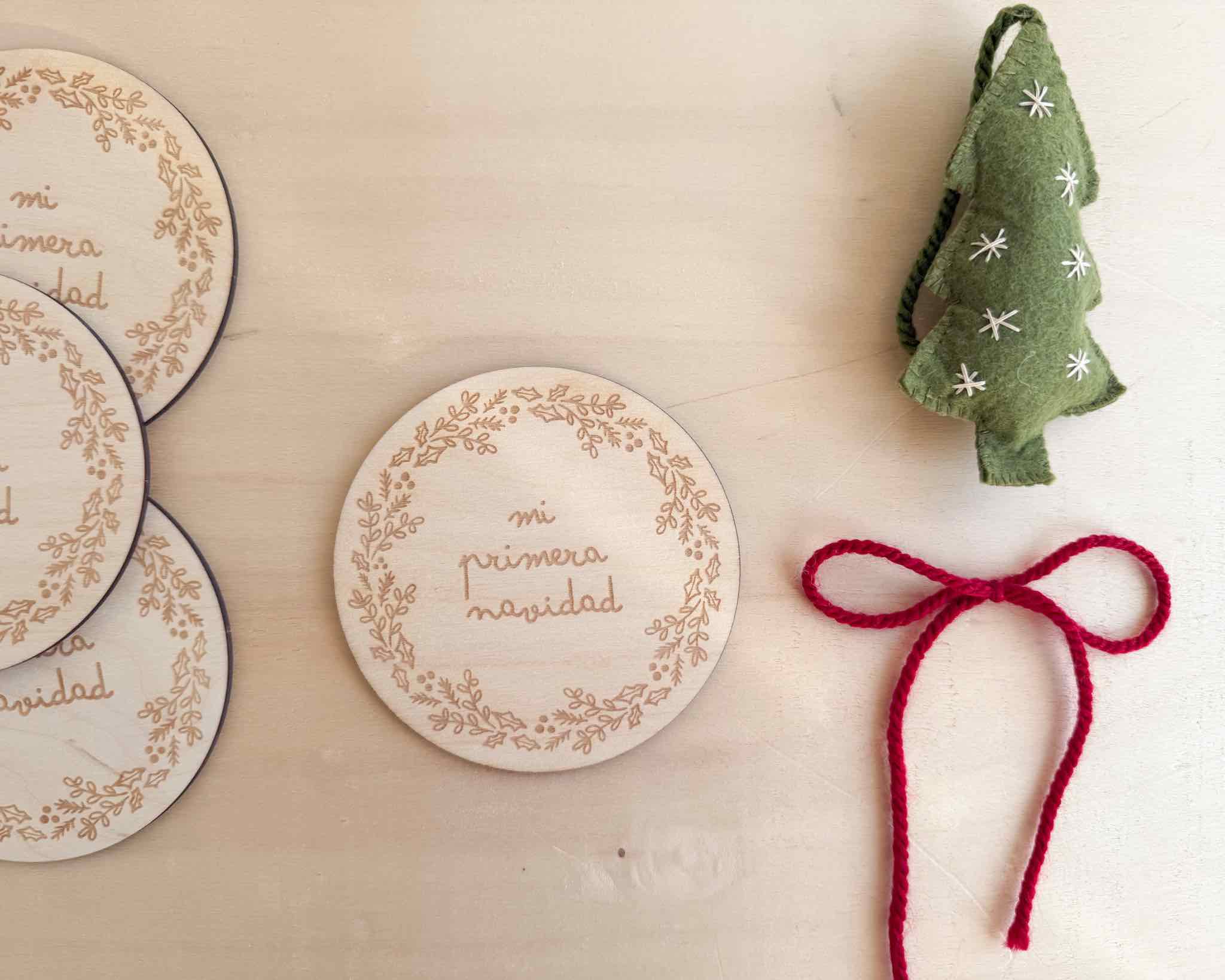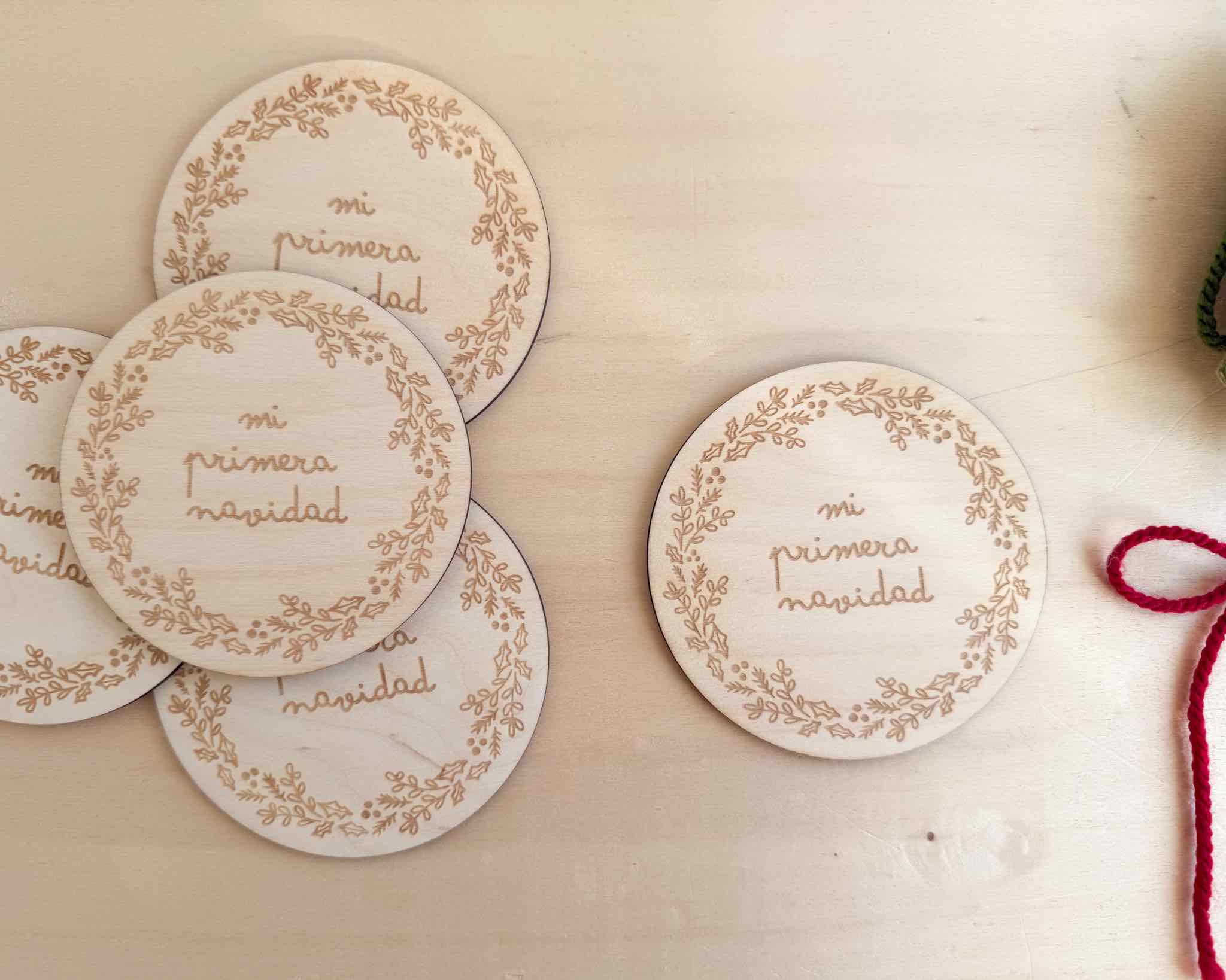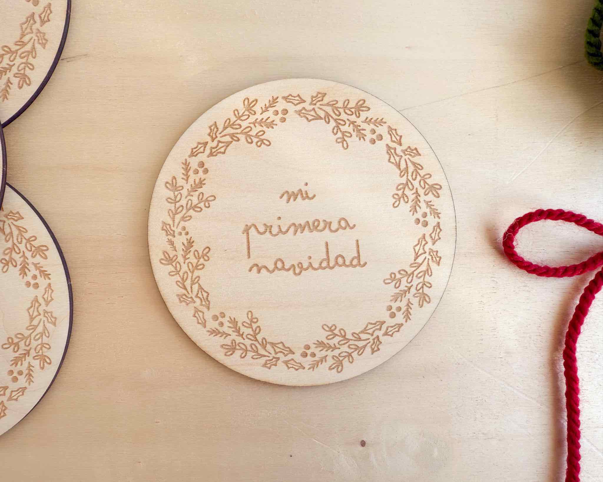 Plaquita de madera redonda «Mi Primera Navidad», con la que podrás crear un montón de recuerdos súper chulos al hacerle su primera sesión de fotos navideña.